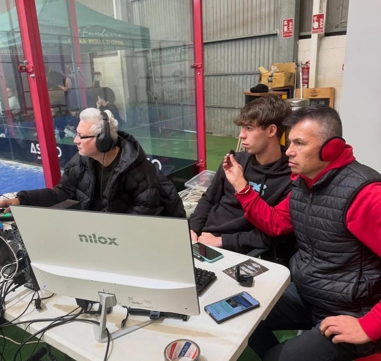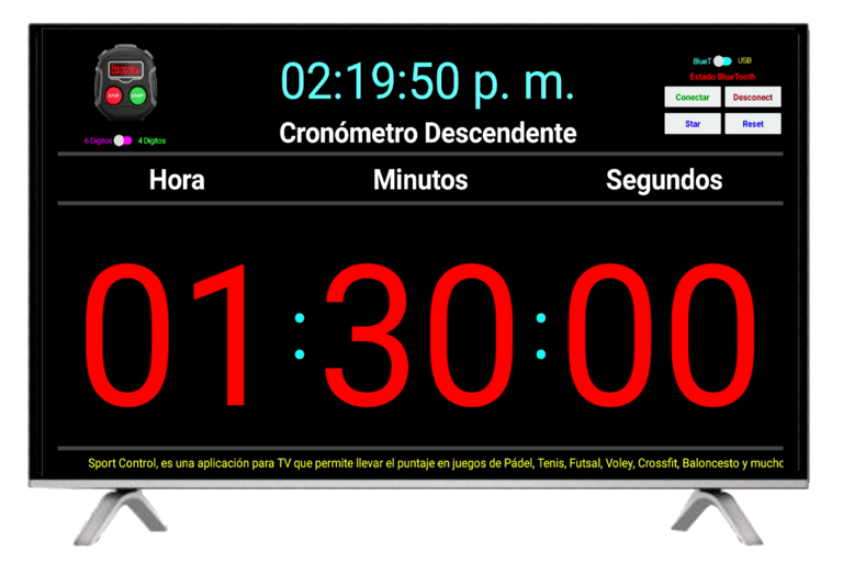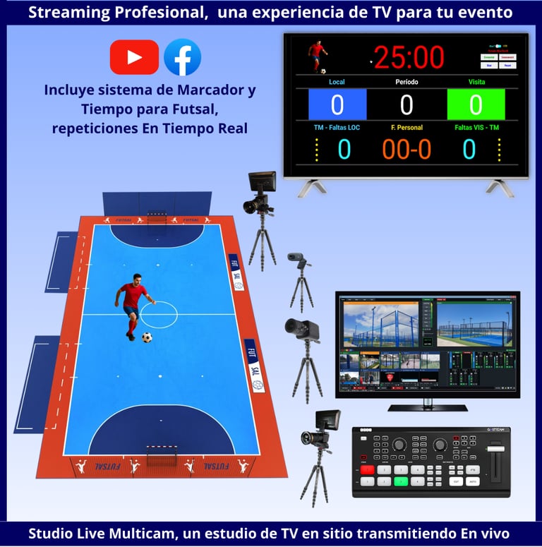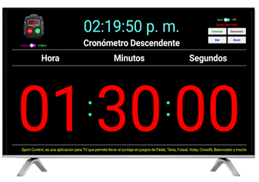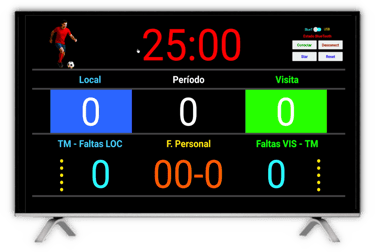 Acompañamos la transmisión a redes sociales con un Tablero de tiempo y puntos que lleva y muestra la información del juego y que también mostramos en un TV en el sitio del evento. Tenemos tableros para Pádel, Futsal, Tenis, Badminton, Fútbol, Baloncesto, Voleibol y muchos deportes más.