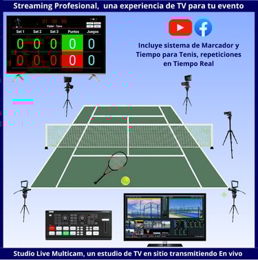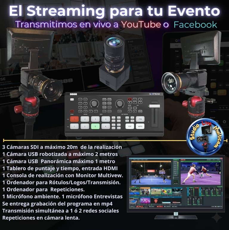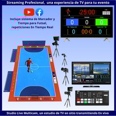 El sistema completo de streaming consta de 4/5 cámaras, 1 Laptop, 1 PC, 1 Consola profesional o Switch de vídeo, un sistema redundante de transmisión de datos a internet. Las cámaras con sus trípodes pueden ubicarse a 20 metros de distancia del centro de mando o realización sin que la imagen sufra variaciones, incluso pueden llegar a ubicarse a 100 metros, pues el protocolo de transmisión de datos SDI es digital y sin comprimir lo que garantiza una imagen perfecta sin pérdidas. Trabajamos en un formato de 1920 x 1080 píxeles / 30fps