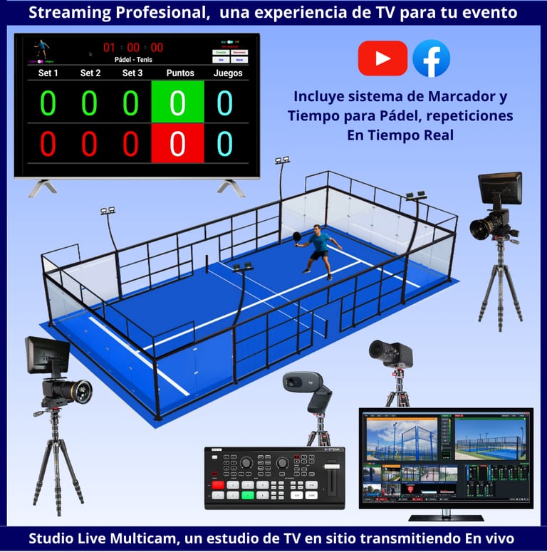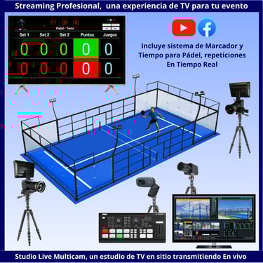 Tenemos un servicio de transmisión en vivo profesional para eventos deportivos, pensado específicamente en aumentar la visibilidad, atraer nuevos jugadores, darle un valor añadido a quienes ya disfrutan de tus instalaciones. Contamos con un sistema único de marcador y tiempo que mostramos en tiempo real, además está optimizado para diferentes deportes: Pádel, Futsal, Tenis Fútbol 11, Voley Playa, Baloncesto y muchos deportes más.